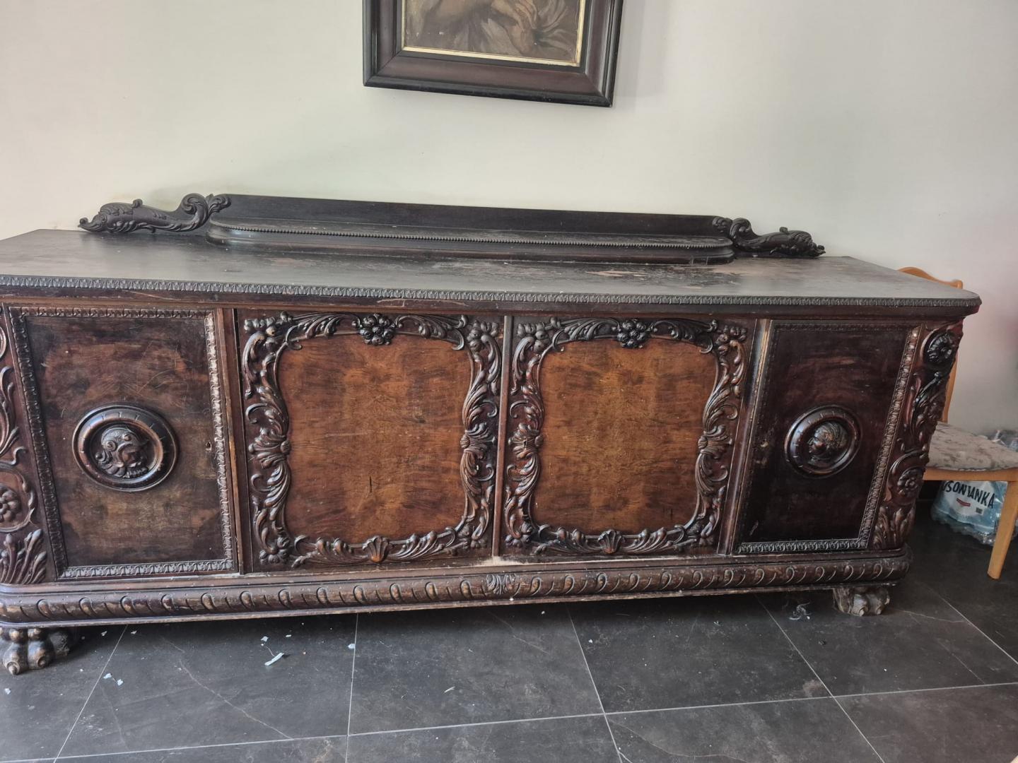 Die historische Kommode mit reich verzierten, geschnitzten Fronten wurde einer Vorrestaurierung unterzogen, die die sorgfältige Entfernung der alten Beize und Lackschichten sowie jahrelanger Verschmutzungen umfasste.